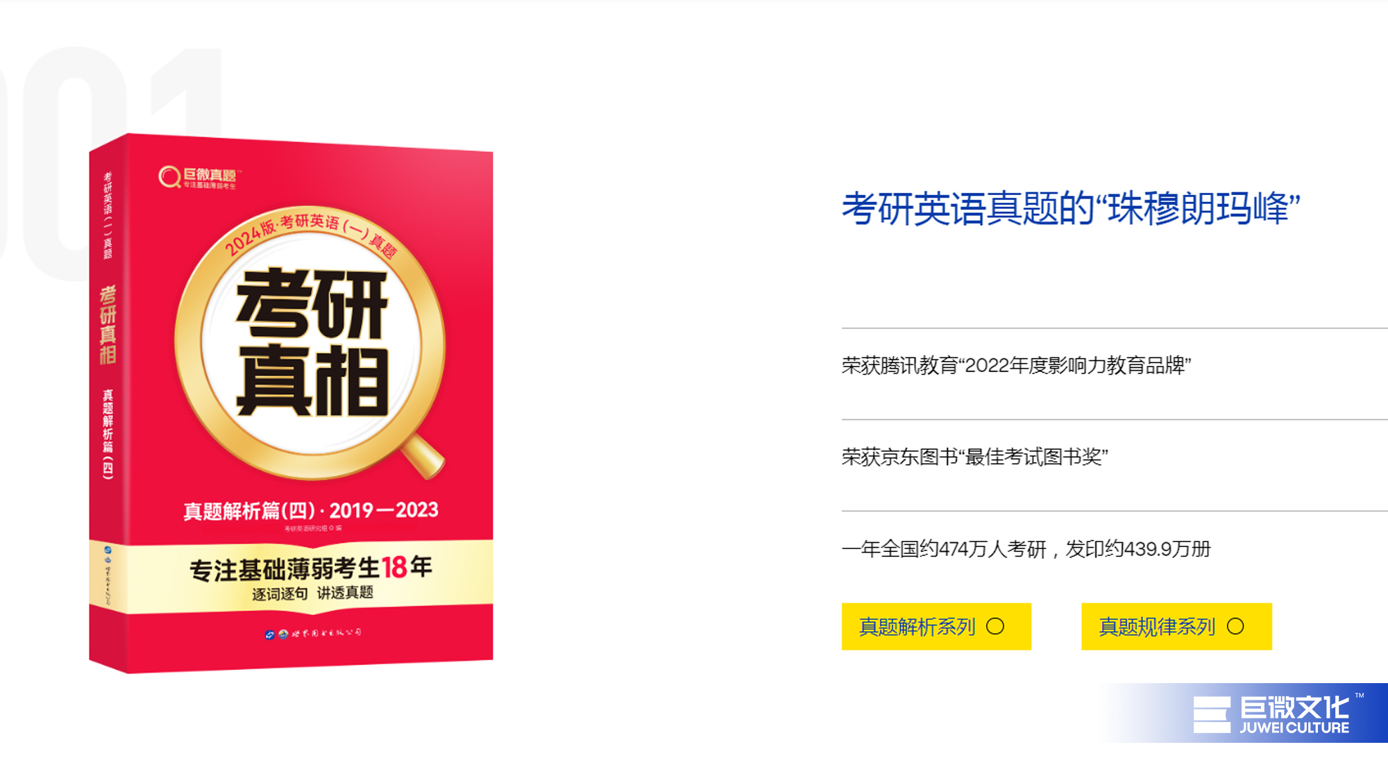 八年,我们的产品体系实现了多学段、多品类、全学科的覆盖,考研真相、巨微真题、闪过、洞穿教育、练家子、龙门大决战等优秀品牌相继诞生,服务着数以千万计的考生。