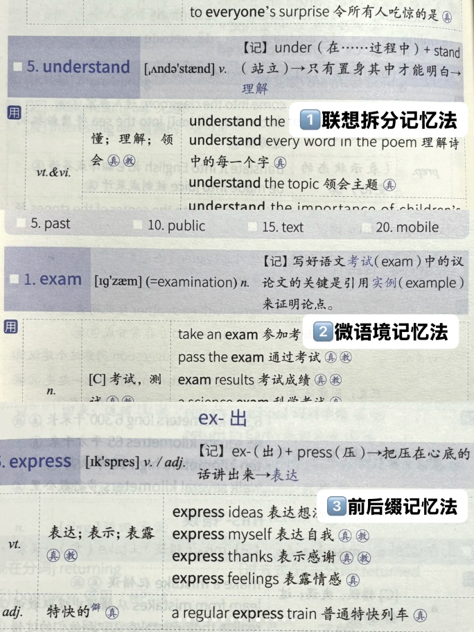 ·高效记忆法:搭配微语境记忆、拆分联想、词根词缀三类实用方法,结合具体语境,帮助快速理解、牢固记忆词汇。