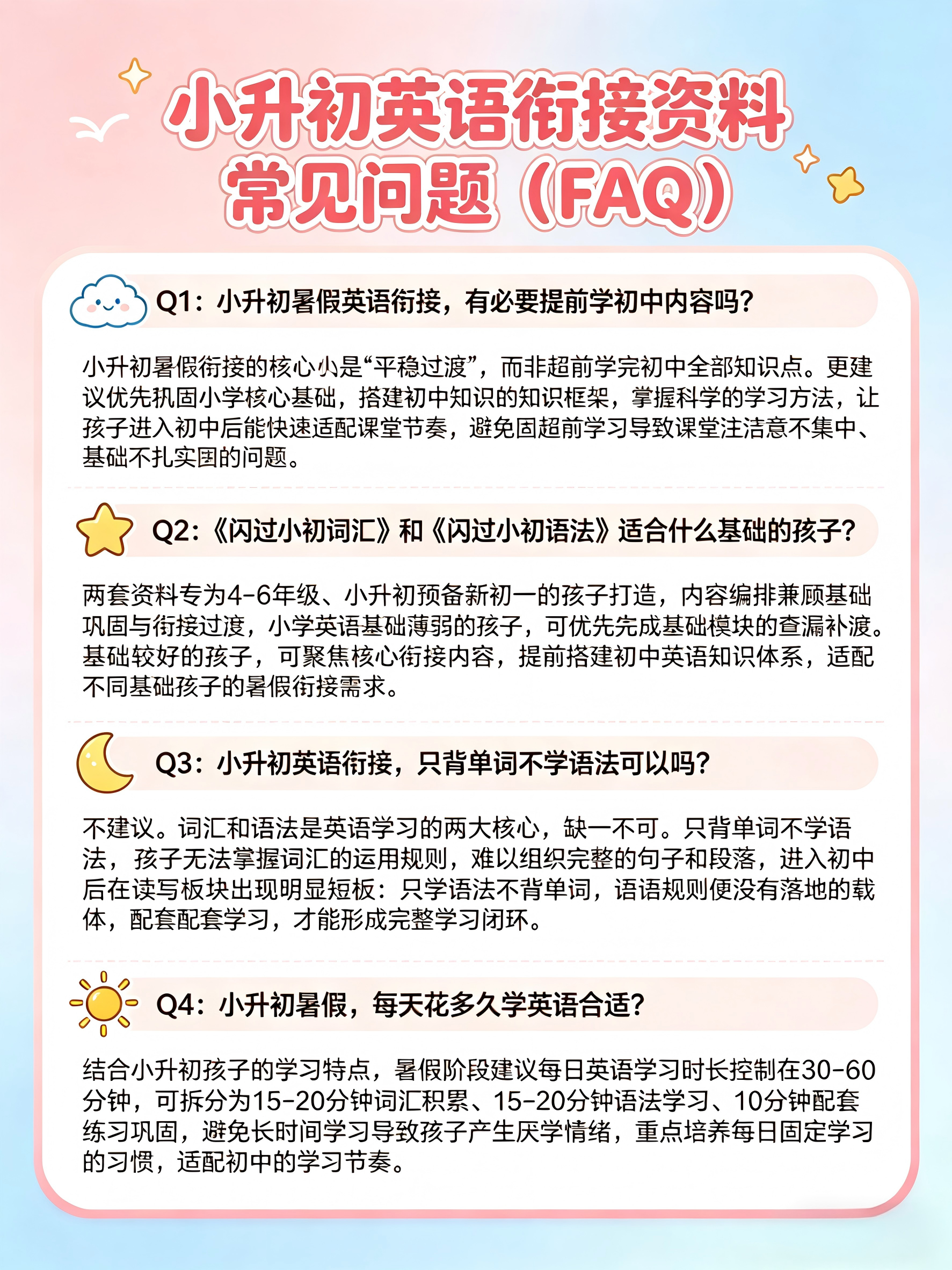 对于小升初的孩子来说,暑假衔接的核心,是平稳跨越学习阶段的断层,搭建适配初中的知识框架与学习习惯。《闪过小初词汇》与《闪过小初语法》依托专业教研能力与严格的品质保障,精准贴合小初衔接学情,为孩子提供了体系完整、适配性强的学习方案。资料只是辅助工具,唯有贴合孩子基础、制定合理规划,才能让暑假衔接真正发挥价值。